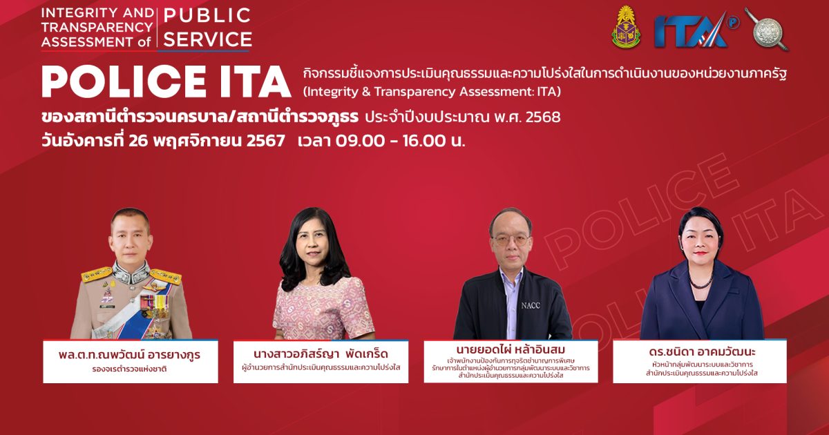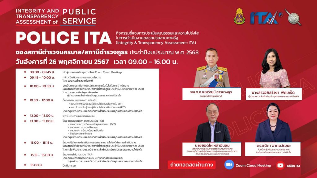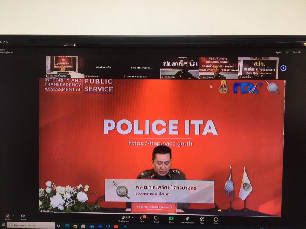 วันนี้ 26 พ.ย.67 เวลา 09.00 น. พ.ต.อ.ภัทรพล กมล ผกก.สภ.โนนคูณ มอบหมายให้ พ.ต.ต.หญิงสุภาพร ป้องเศร้า สว.อก.สภ.โนนคูณ ,ร.ต.อ.แสงอุทัย โคตรสมพงษ์ รอง สว.ธร.สภ.โนนคูณ เข้าร่วมกิจกรรมชี้แจงการประเมินคุณธรรมและความโปร่งใสในการดำเนินงานของหน่วยงานภาครัฐ (ITA) ของสถานีตำรวจนครบาลและสถานีตำรวจภูธร ประจำปีงบประมาณ พ.ศ. 2568 รูปแบบ online ในวันอังคาร ที่ 26 พ.ย. 67 โดยมี พล.ต.ท.ณพวัฒน์ อารยางกูร รองจเรตำรวจแห่งชาติ เป็นประธานในพิธีเปิด ผ่านระบบ ZOOM Meeting ณ ห้อง ศปก.สภ.โนนคูณ